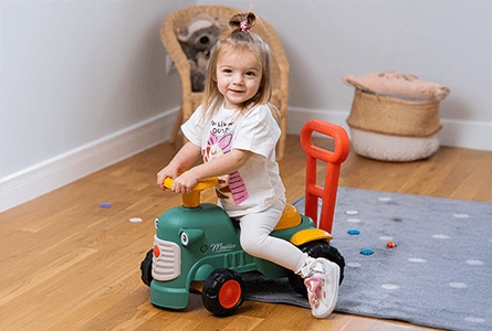 Des porteurs Maurice et Marcel dès 12 mois, aux tracteurs à pédales équipés de remorque, chaque jouet en plastique recyclé est une promesse de jeu en plein air, d’imitation et de fous rires partagés.