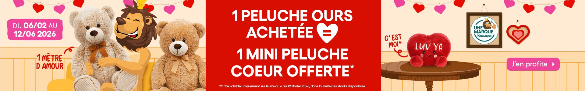 Pour fêter la Saint-Valentin, King Jouet vous propose une sélection parfaite pour gâter ceux que vous aimez : des jeux de construction pour stimuler leur créativité, des peluches câlines pour des moments tendres et plein de douceur ou encore des jeux de société pour des instants conviviaux à partager à deux. Offrez le cadeau idéal et créez des souvenirs inoubliables !
